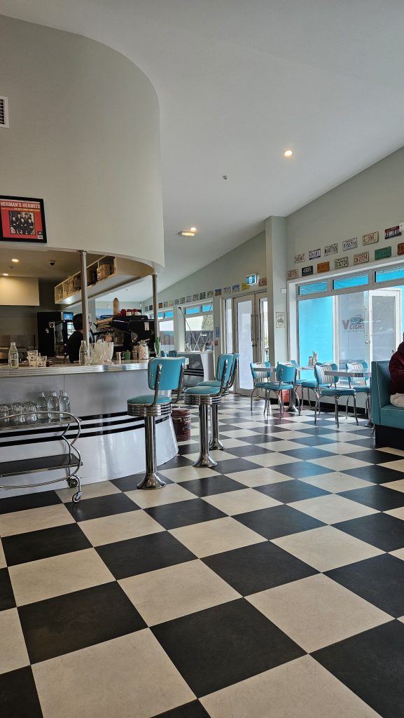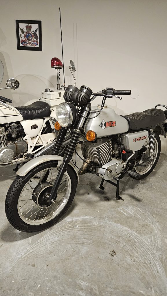 Nun besuchen wir noch ein besonderes Kaffee. Die Einrichtung scheint uns in die 60-iger 70-iger Jahre zu entführen. Es verbirgt Autos dieser Zeit! Woher kommt die MZ? Auf so einer habe ich 1977 meine Motorradprüfung gemacht. Und in weiteren Räumen Kunst.