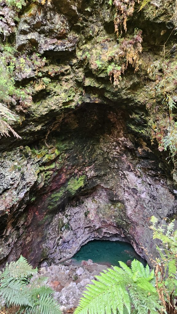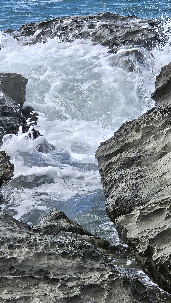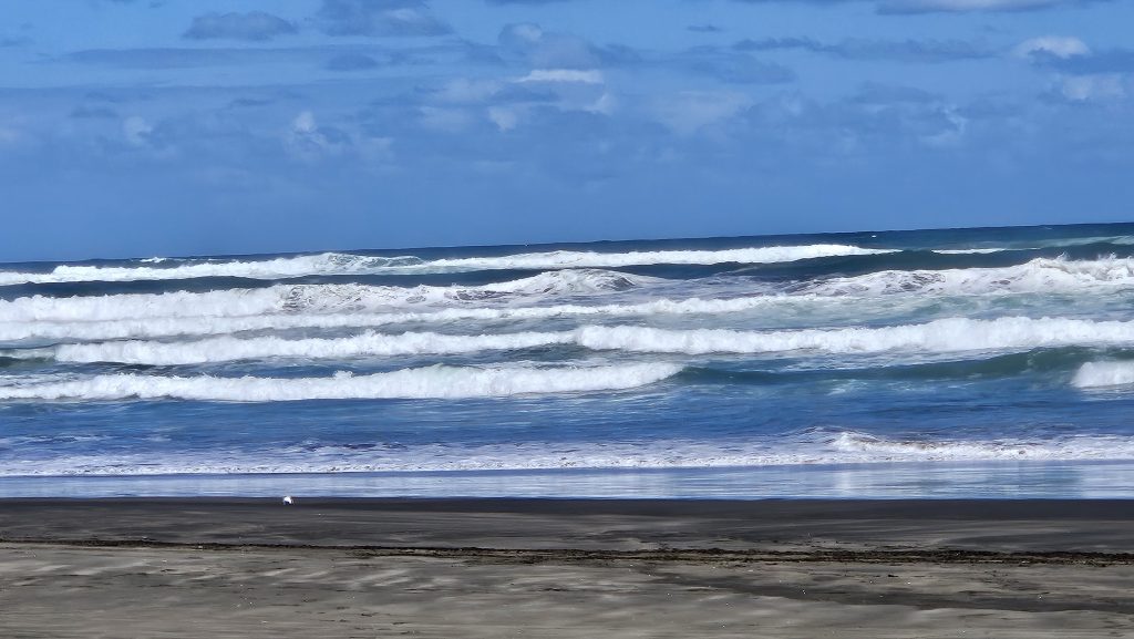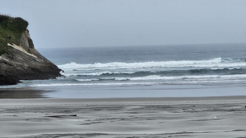 Wir haben noch etwas Zeit und unternehmen eine Wanderung an den Strand. Die Wellen sind so hoch, vorm Baden wird gewarnt. In einer Höhle ruht er sich aus!