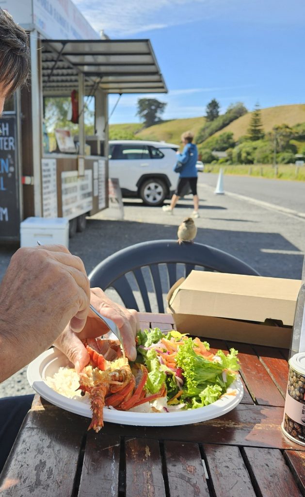 Auf dem Weg dahin haben wir Glück mit dem Wetter. Es ist zwar erst kurz nach dem Frühstück, aber diesen Riesenkrebs gegrillt müssen wir probieren.