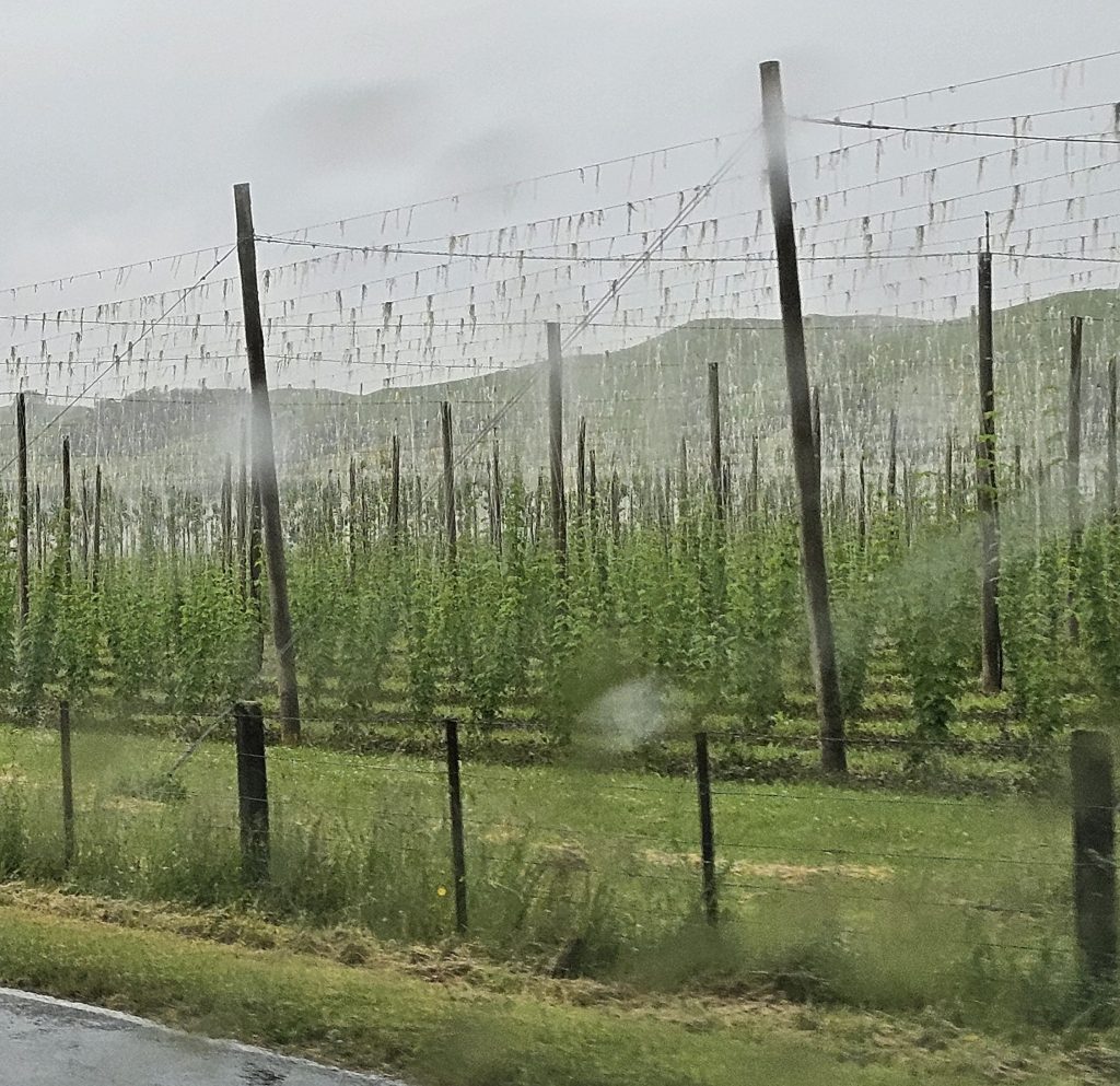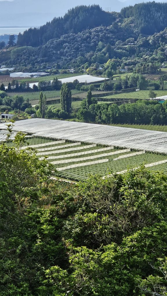Auf dem Rückweg zu unserer Lodge sehen wir viele Obstplantagen. Oft sind die Pflanzen mit sogenannten „Crop Covers“ (Netzen oder Planen) geschützt, um die Kiwis, Äpfel, Birnen, Erdbeeren vor Wetterextremen, wie Hagel, starker Sonne und Schädlingen zu schützen.