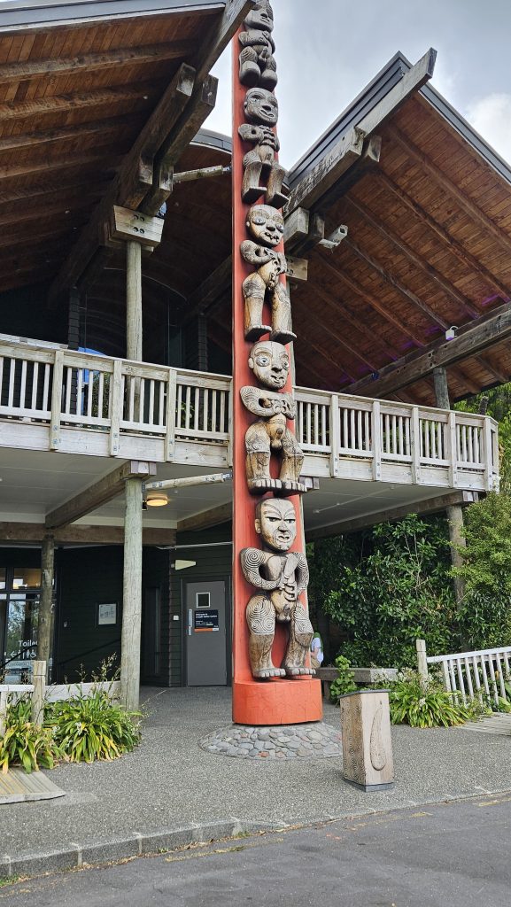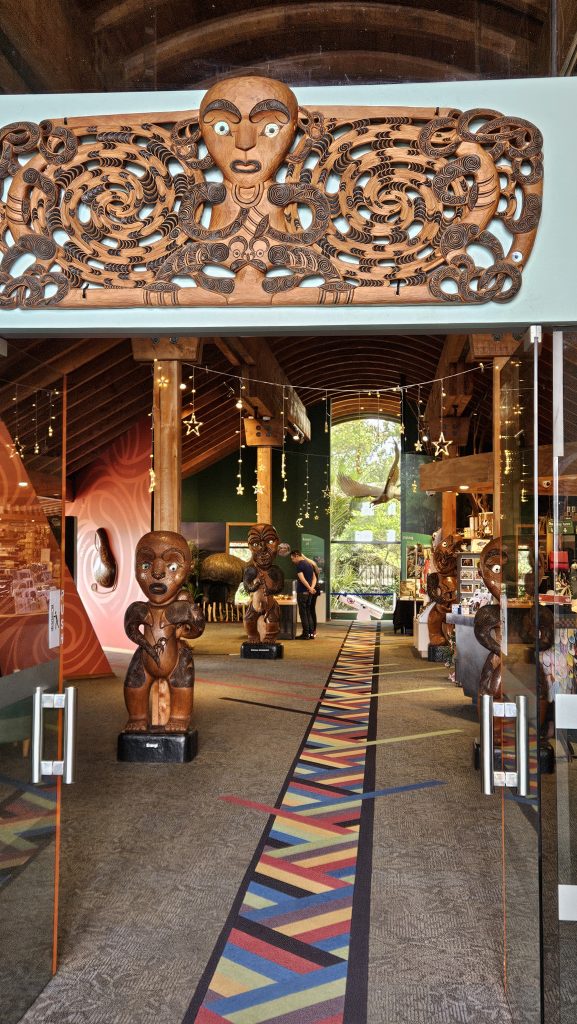 Heute besuchen wir das Maori-Museum in der Nähe. Wir sehen herrliche Holzschnitzereien, den riesigen Park am Meer, den Versammlungsraum, wo auch die Tänze vorgeführt werden. Alles ist sehr ordentlich angelegt. In den Häusern wird nicht über die Einheimischen berichtet, sondern die Herrschaften, die Waitangi besiedelten. Wir wurden eingewiesen für die Tänze.