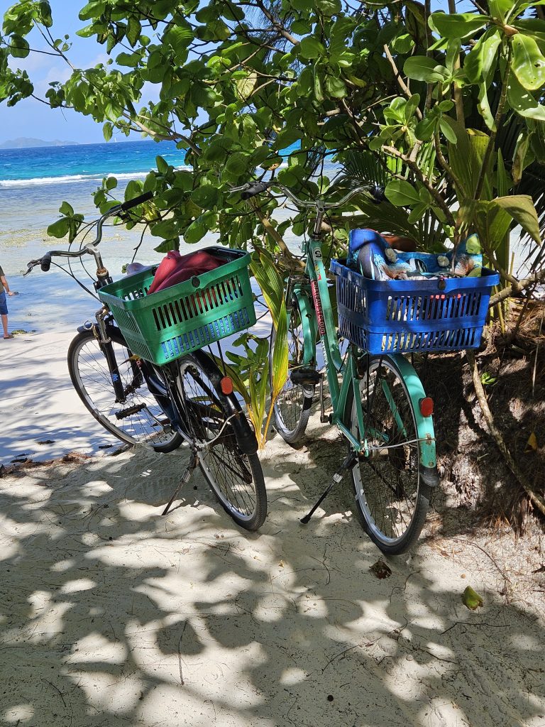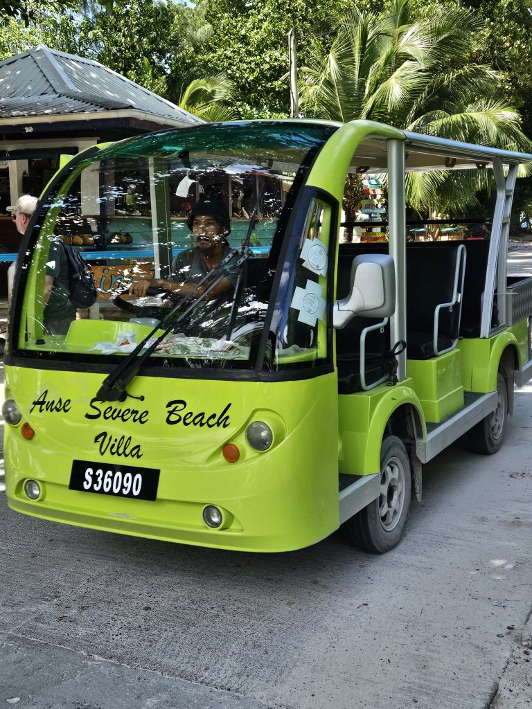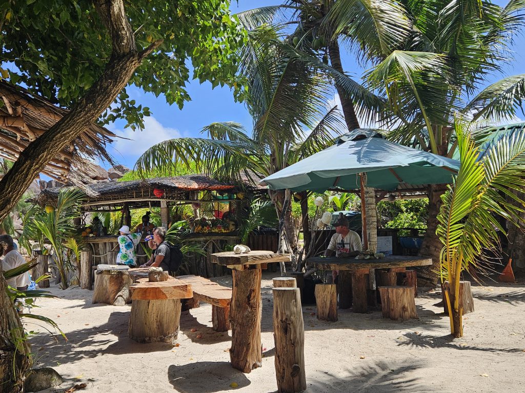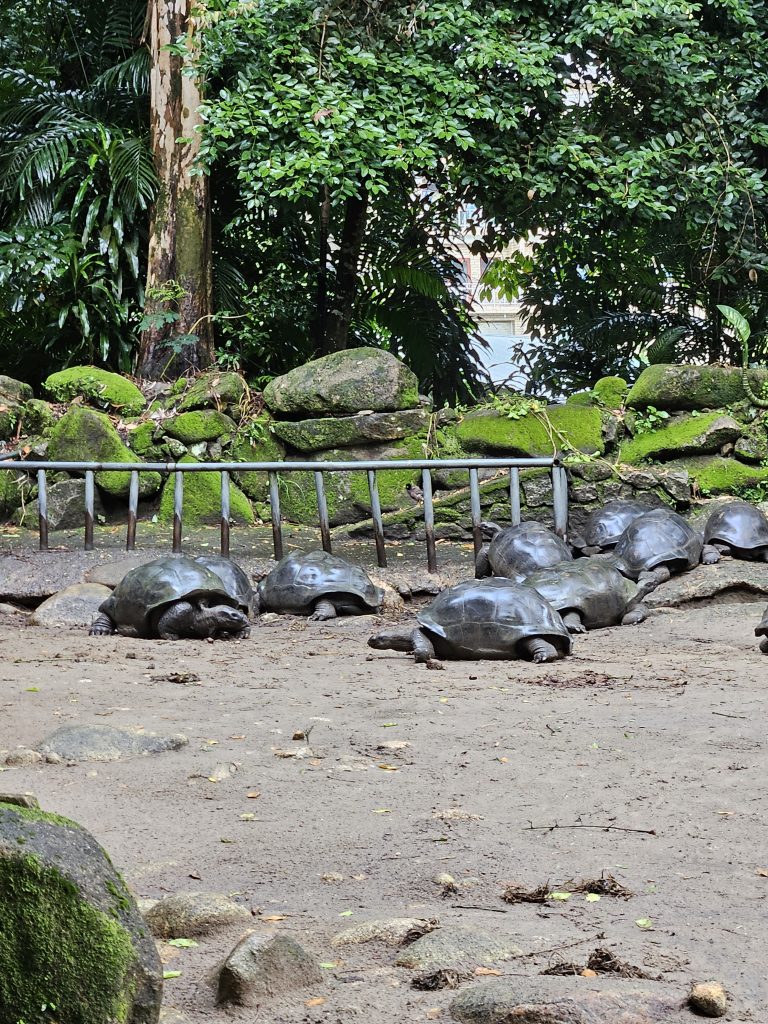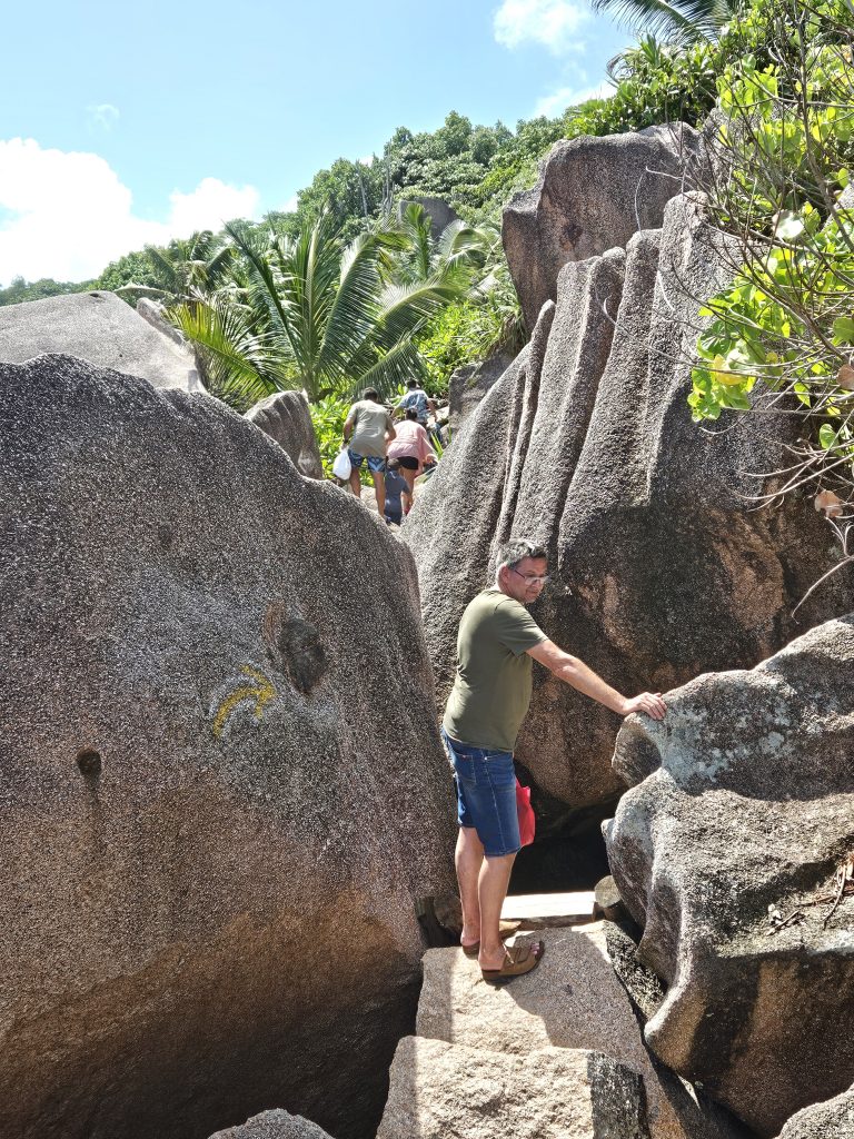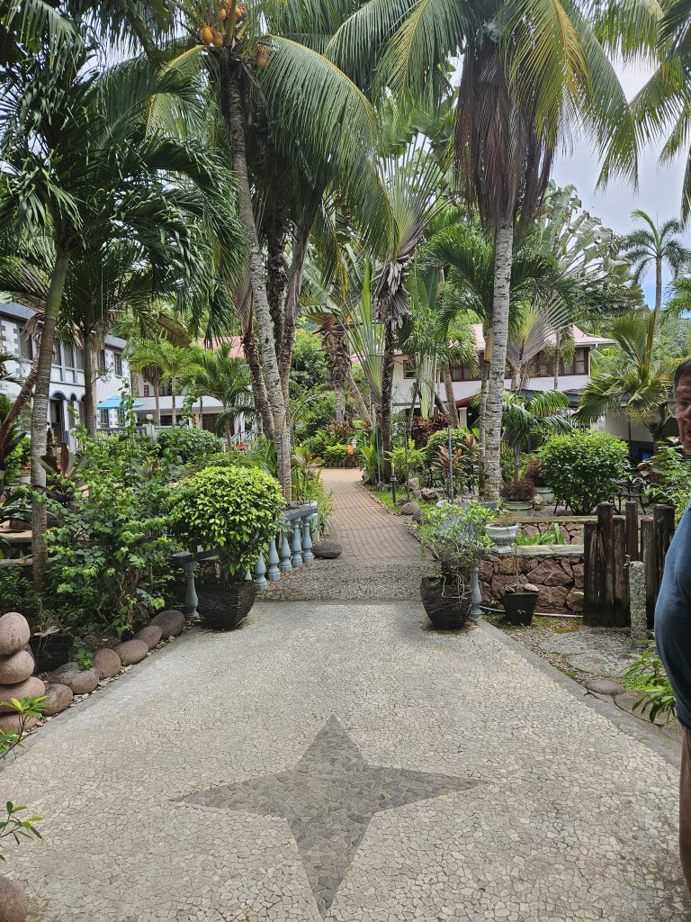 Doch vorher besuchen wir eine Insel. Juli und Melidor wohnten darauf 42 Jahre. Heute wachsen Ölpalmen, Kreolische Früchte und Kaffeepflanzen hier. Auf dem Rundweg sehen wir heimisch gewordene Riesenschildkröten.