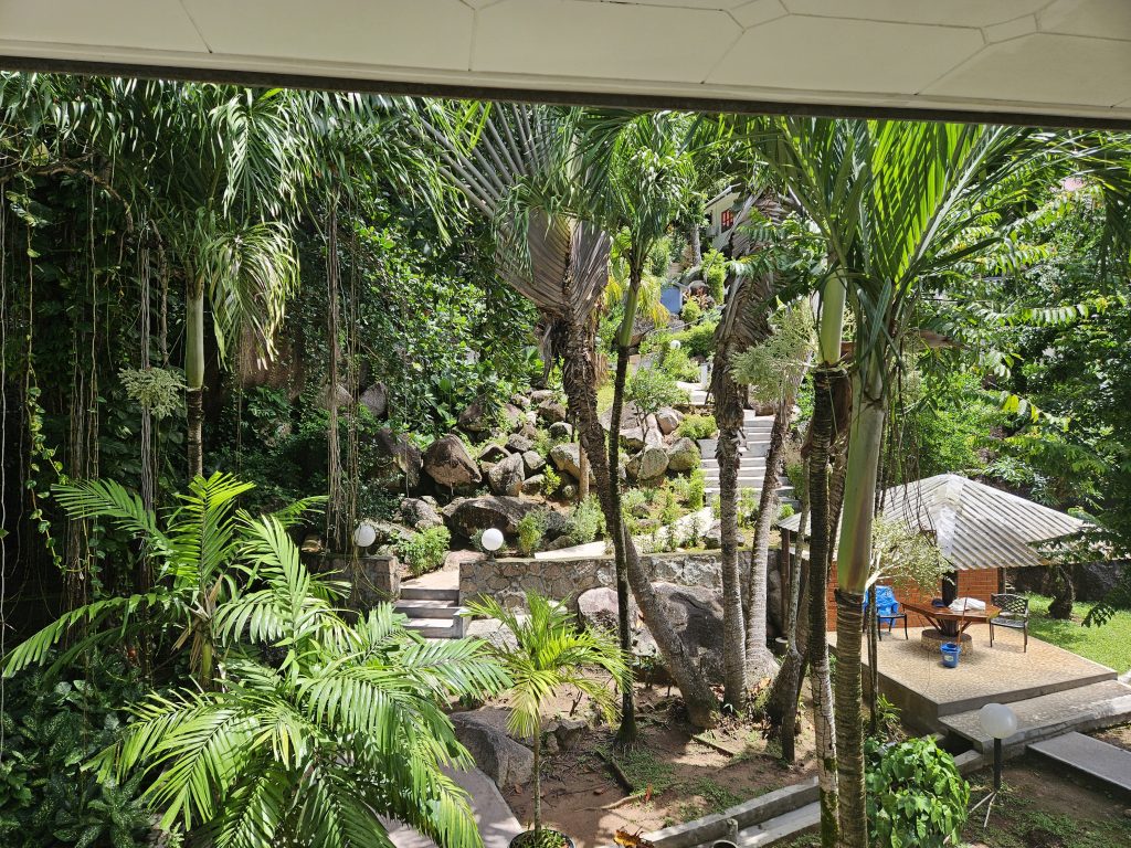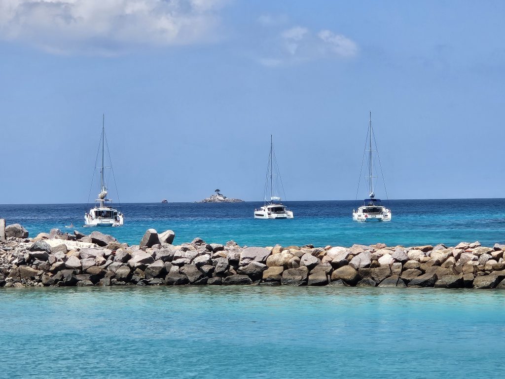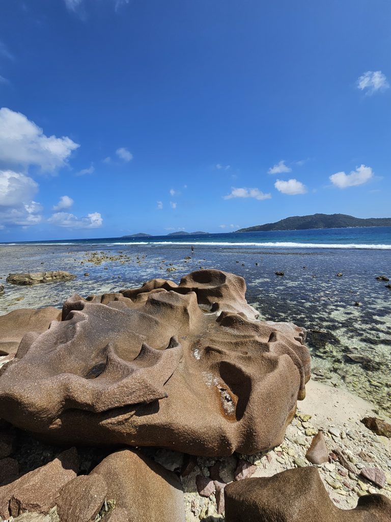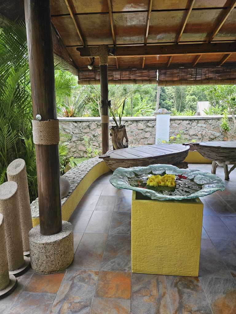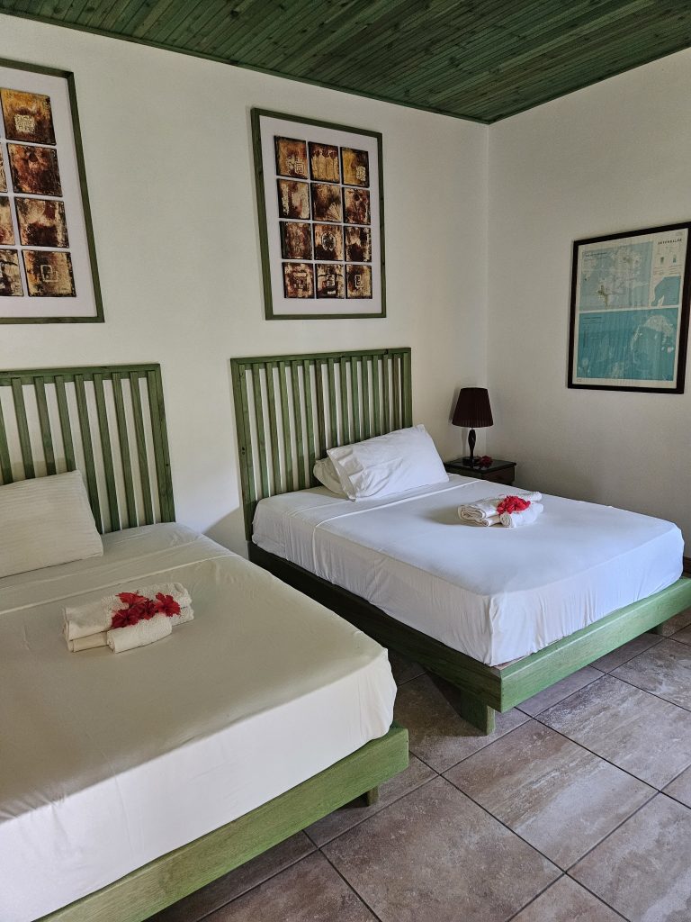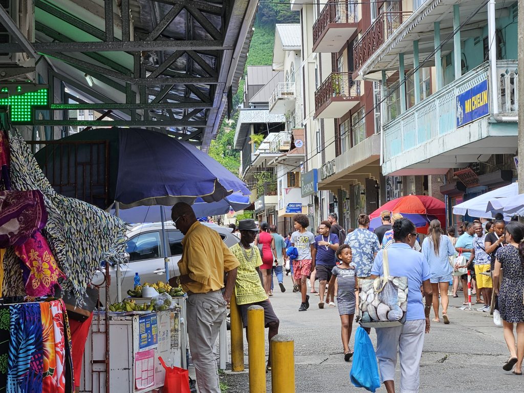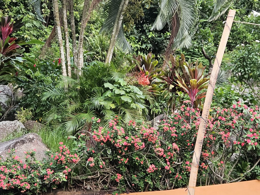 Doch vorher besuchen wir eine Insel. Juli und Melidor wohnten darauf 42 Jahre. Heute wachsen Ölpalmen, Kreolische Früchte und Kaffeepflanzen hier. Auf dem Rundweg sehen wir heimisch gewordene Riesenschildkröten.