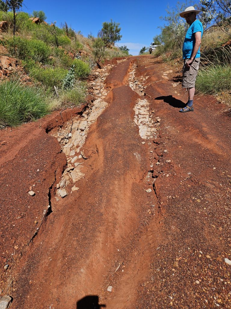Eigentlich wollen wir heute in den Mount Augustus National Park. Gestern hatten wir uns nach einem Zimmer umgehört und es bestellt. Wir fahren los und nach kurzer Zeit ist die Straße sehr ausgewaschen und auch das Allradauto kann Probleme machen. Die Furchen sind jetzt schon so tief, dass wir uns entschließen diese Landstraße nicht zu nutzen. Wir kennen uns nicht aus und wollen nicht im Outback liegen bleiben. Also geht es zurück auf die Autobahn, in der Hoffnung in ihrer Nähe auch ein Zimmer zu bekommen.