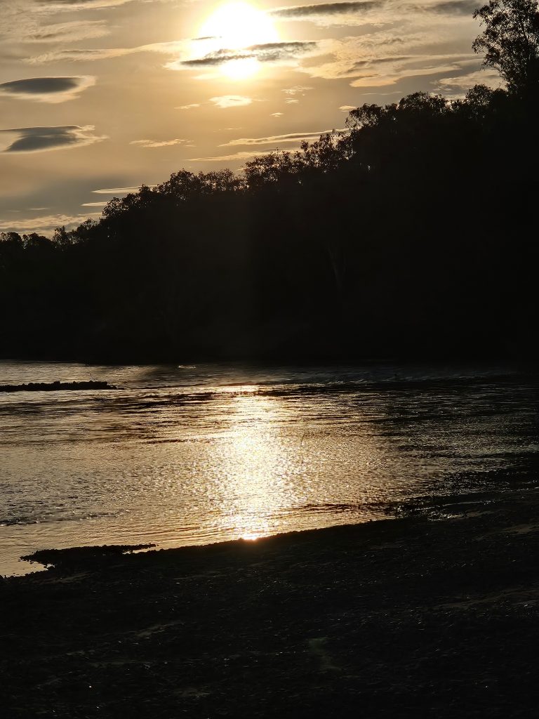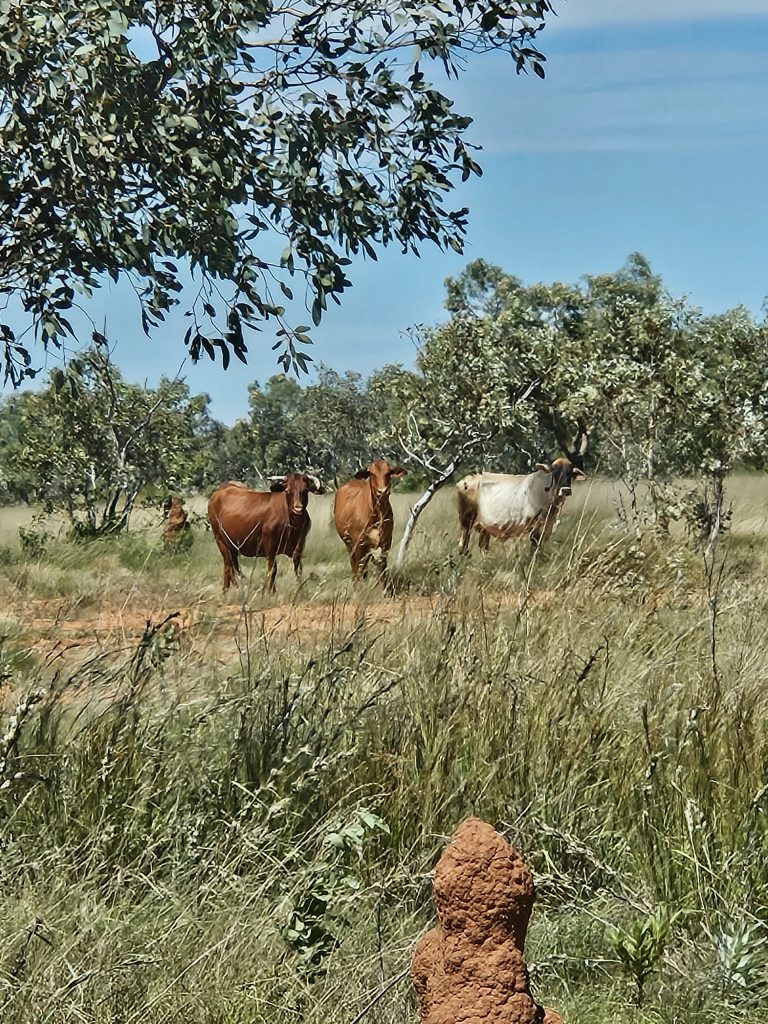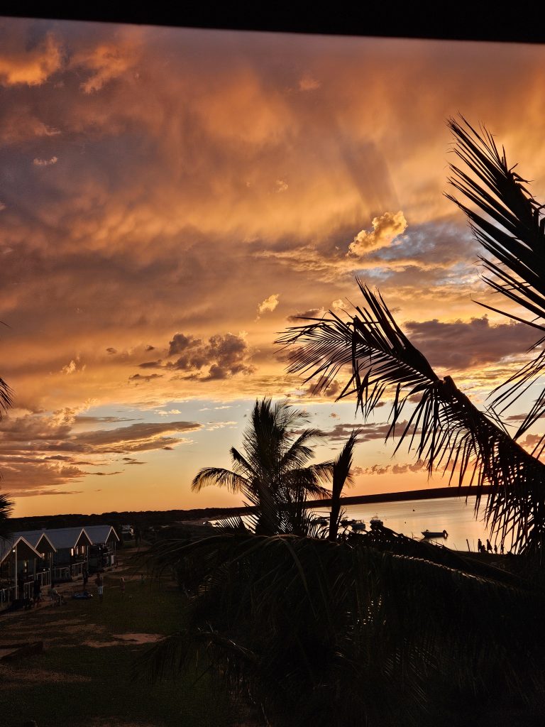 Unterwegs sehen wir diese Kühe. Dann kommen wir in der Fitzroy River Lodge an, herrlich. Hier an der Ecke ist unser Zimmer, das Auto steht darunter im Schatten. Nach einem leckeren Abendbrot genießen wir den Sonnenuntergang.