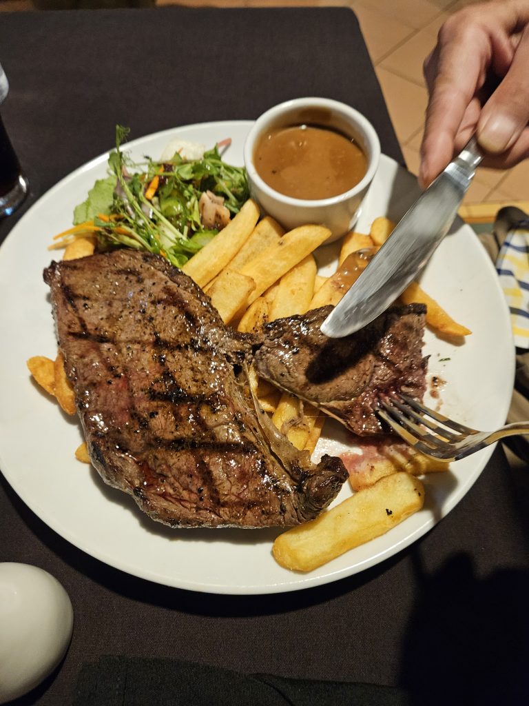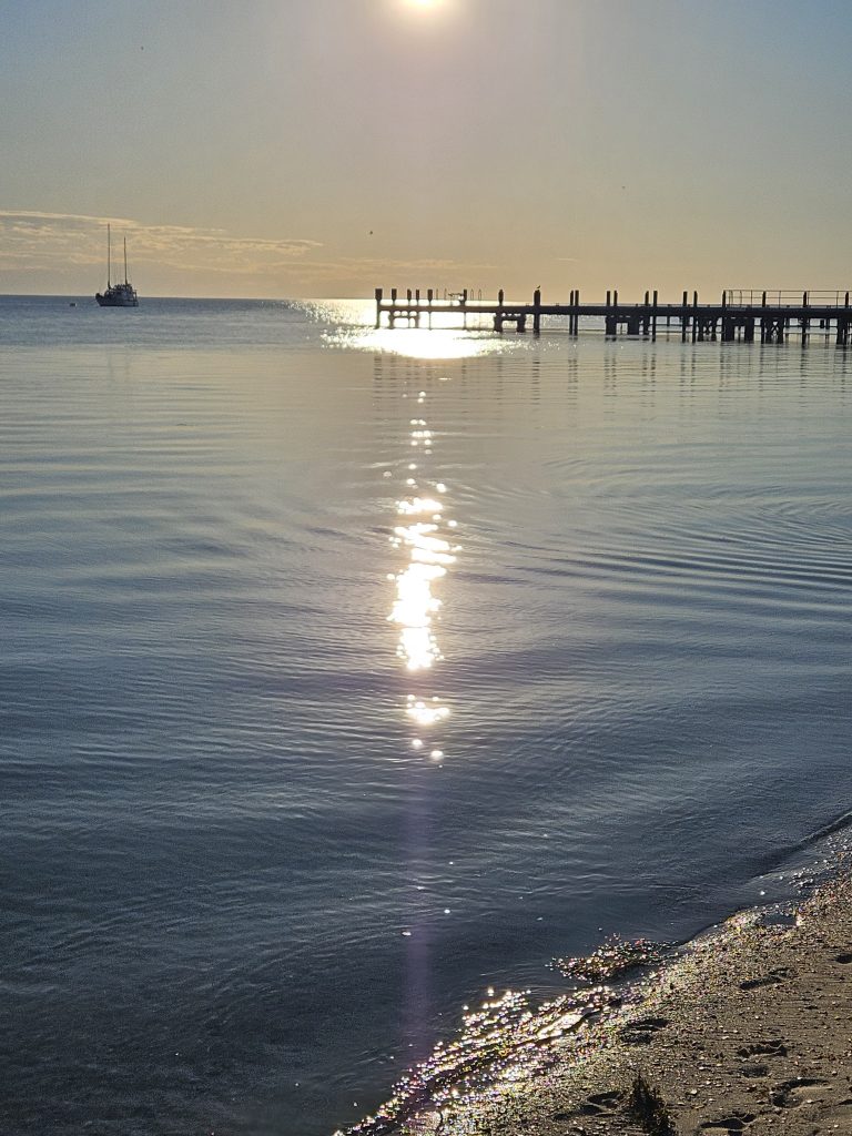 Für den Abend haben wir in der Gaststätte einen Tisch bestellt. Eigentlich gibt es alles im Zimmer und die Lust Essen zu gehen ist gleich Null. Doch wir raffen uns auf und bestellen Steak und einen Salat. Das Meer liegt so ruhig vor uns wir sind total zufrieden mit der Welt. Da hören wir nebenan die deutsche Sprache, fragen das Ehepaar woher sie kommen und merken schnell, dass wir auf einer Wellenlänge sind. Sie lieben es in Australien Urlaub zu machen und stellen uns eine Liste mit Sehenswürdigkeiten für die weitere Fahrt zusammen, die wir dann abarbeiten!