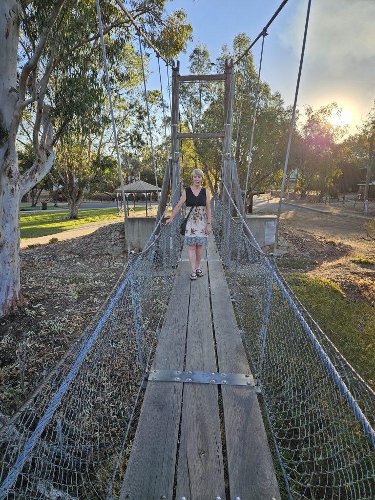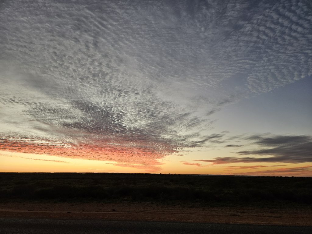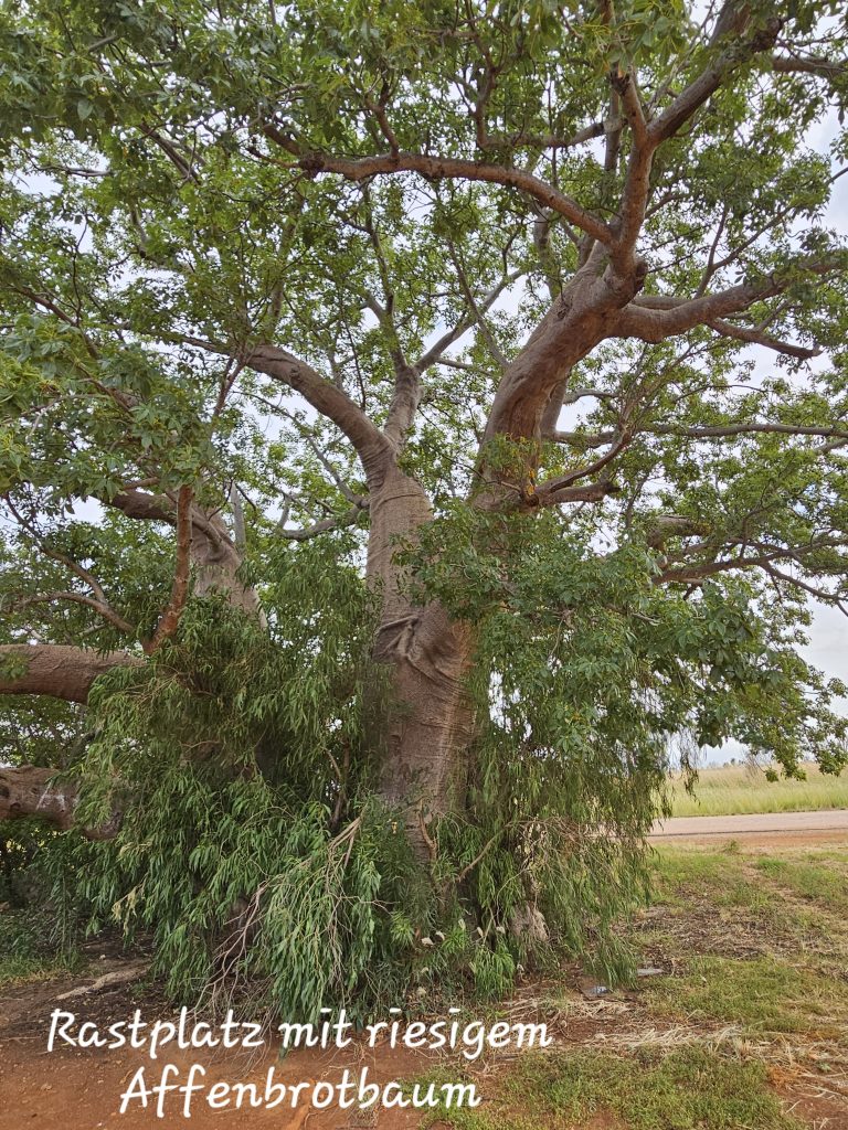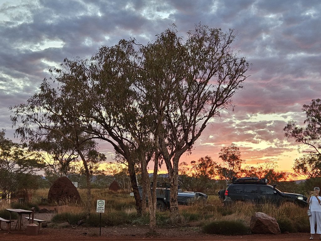 In der Nacht, die ja 18.00 Uhr beginnt, gibt es erst einmal ein lautes Grillenkonzert und später hören wir Hyänen heulen. Das Abendrot ist wirklich toll und wenn es dunkel wird, verschwinden auch die Fliegen. Wir sind um eine interessante Erfahrung reicher. An der Rezeption treffen wir am letzten Morgen eine junge Frau aus Österreich. Sie ist durch „Work and Travel“ schon mehrere Jahre in Australien. (Arbeiten und Reisen).