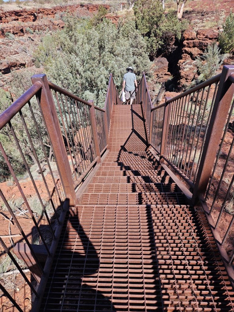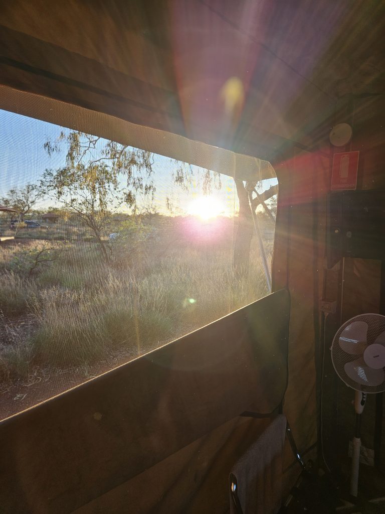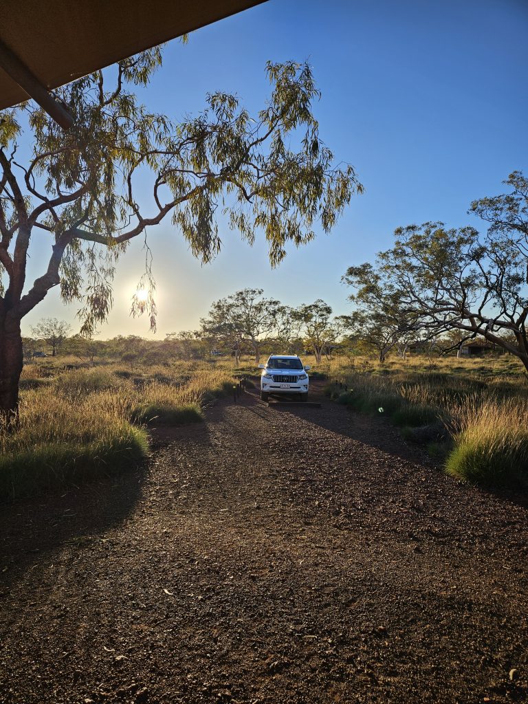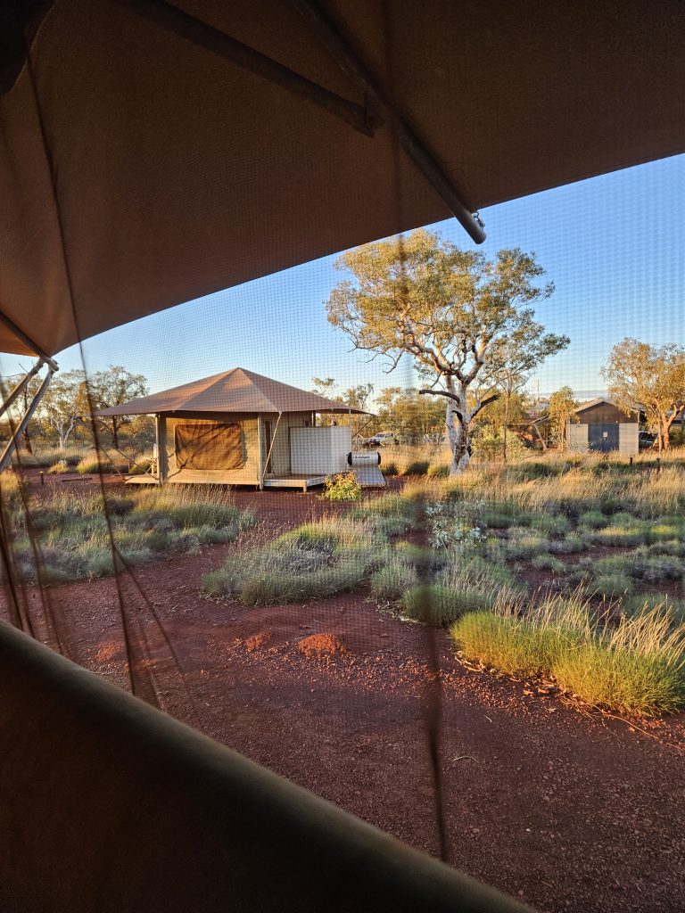 Ein ganz besonderes Zeltlager mit dem Namen Karijini Eco Retrat, DELUXE. Naja, es gibt eine Dusche und Licht. Am Tag sind es ca. 35 Grad, in der Nacht wird es dann angenehmer. Unsere Vorräte kommen in eine Kühlbox für die wir Eis kaufen müssen. Handy-Ladung erfolgt nur in der Gaststätte. Hier kann man frühstücken und essen, doch nicht so lecker, wie in vielen anderen Unterkünften. Auch ein Kaffee zwischendurch ist schwierig. Wir holen Wasser in einer Thermoskanne. Sehr heiß, viele Fliegen und einfach! Die Frau an der Rezeption betont, dass es „Snakes“ (Schlangen) gibt. Also wird darauf geachtet die Reißverschlüsse ordentlich zu schließen.