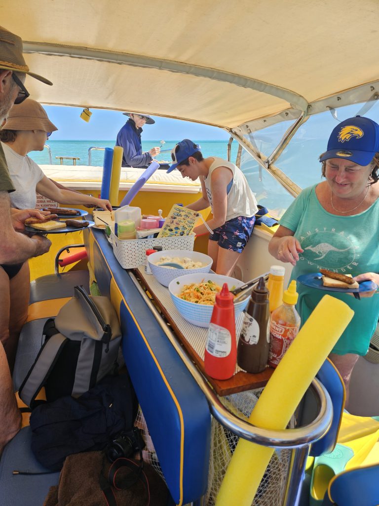So ein fantastischer Sonnenaufgang und auch die Bootstour mit Marie aus München ist ihr Geld wert. Wir sehen viele farbenfrohe Fische, von blau bis violett und auch Schildkröten und Walhaie. Das Wasser ist so klar und zu Mittag gibt es spezielle australische Spezialitäten.