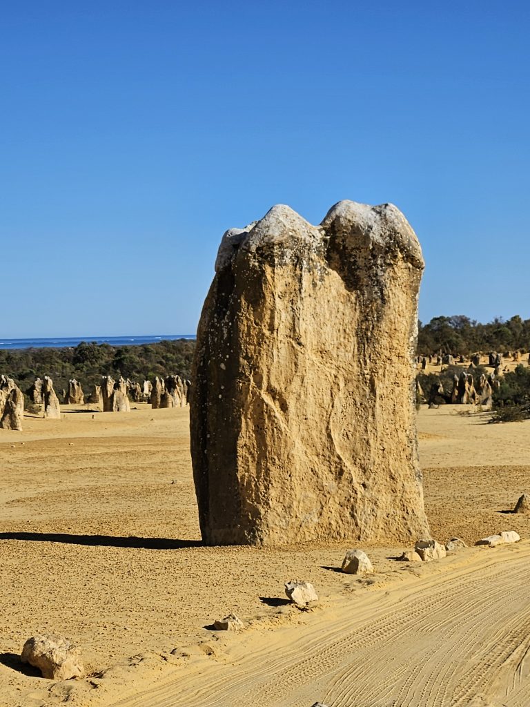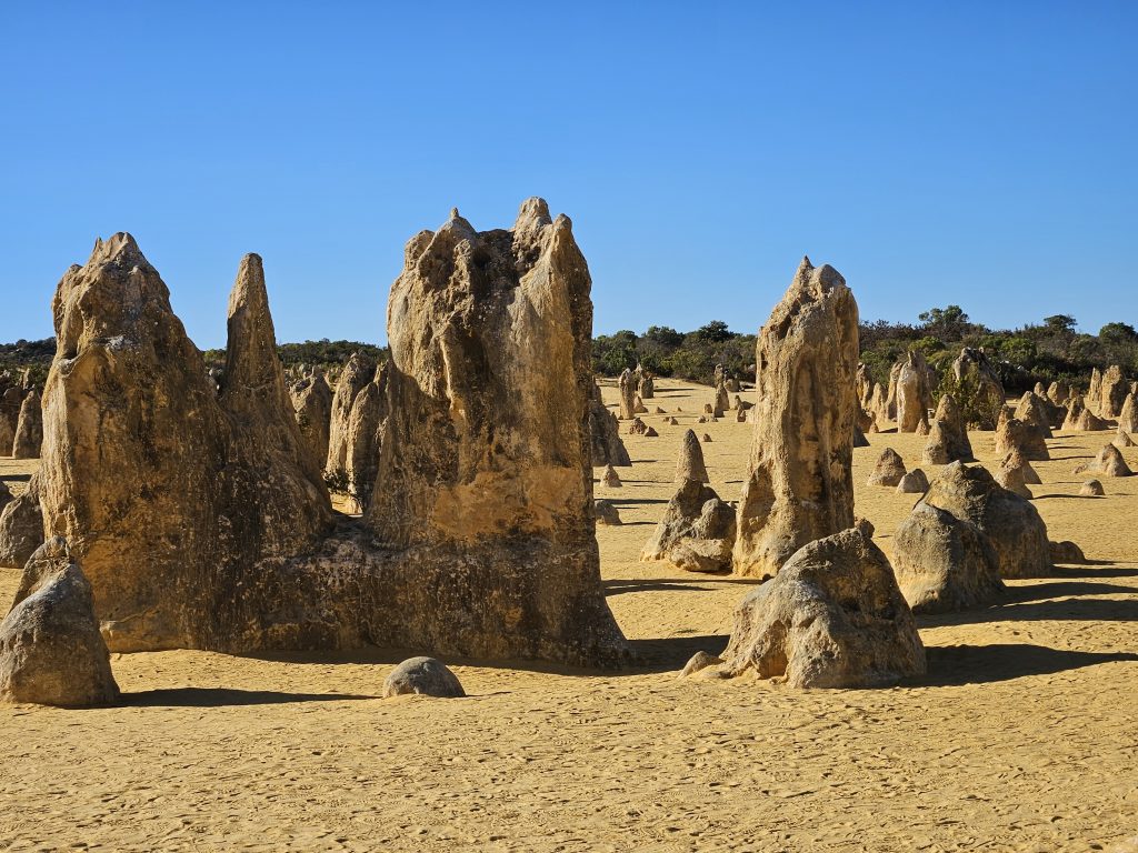 Auf dem Weg zu unserem Pinnacles Edge Resort schauen wir uns natürlich die Kalksteingebilde (Pinnacles) an. Ein Nationalpark, wir zahlen die Gebühr und fahren mit dem Auto an den bizarren Säulen, die bis zu 4 Meter hoch sind, vorbei. Sie machen nur 4 Quadratkilometer des Nambung-Nationalparkes aus.