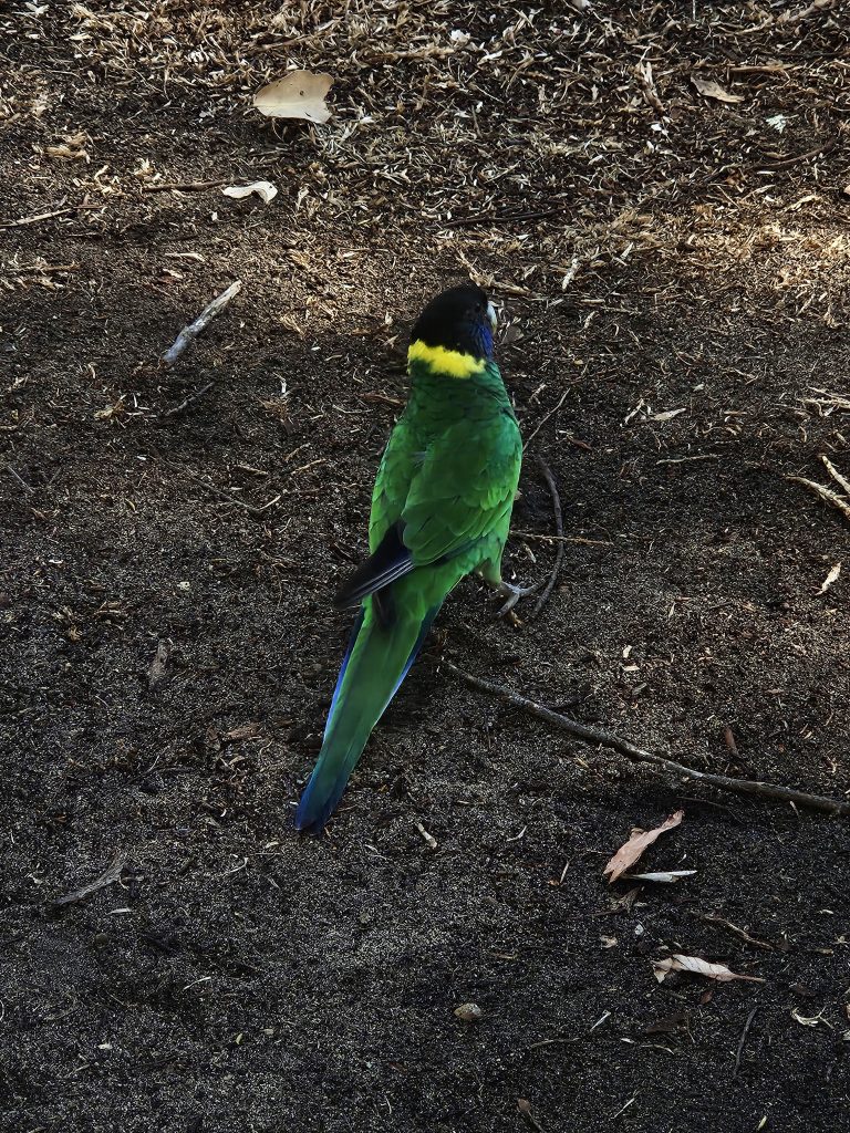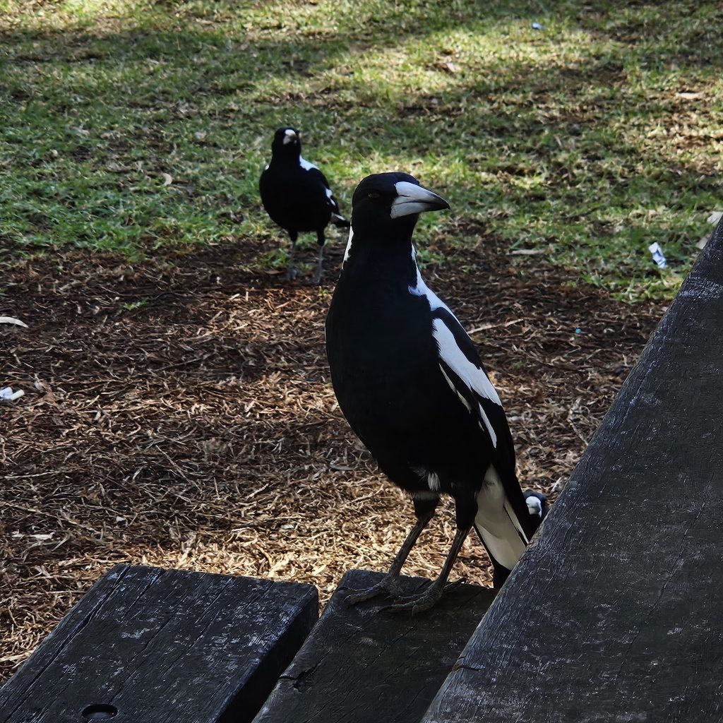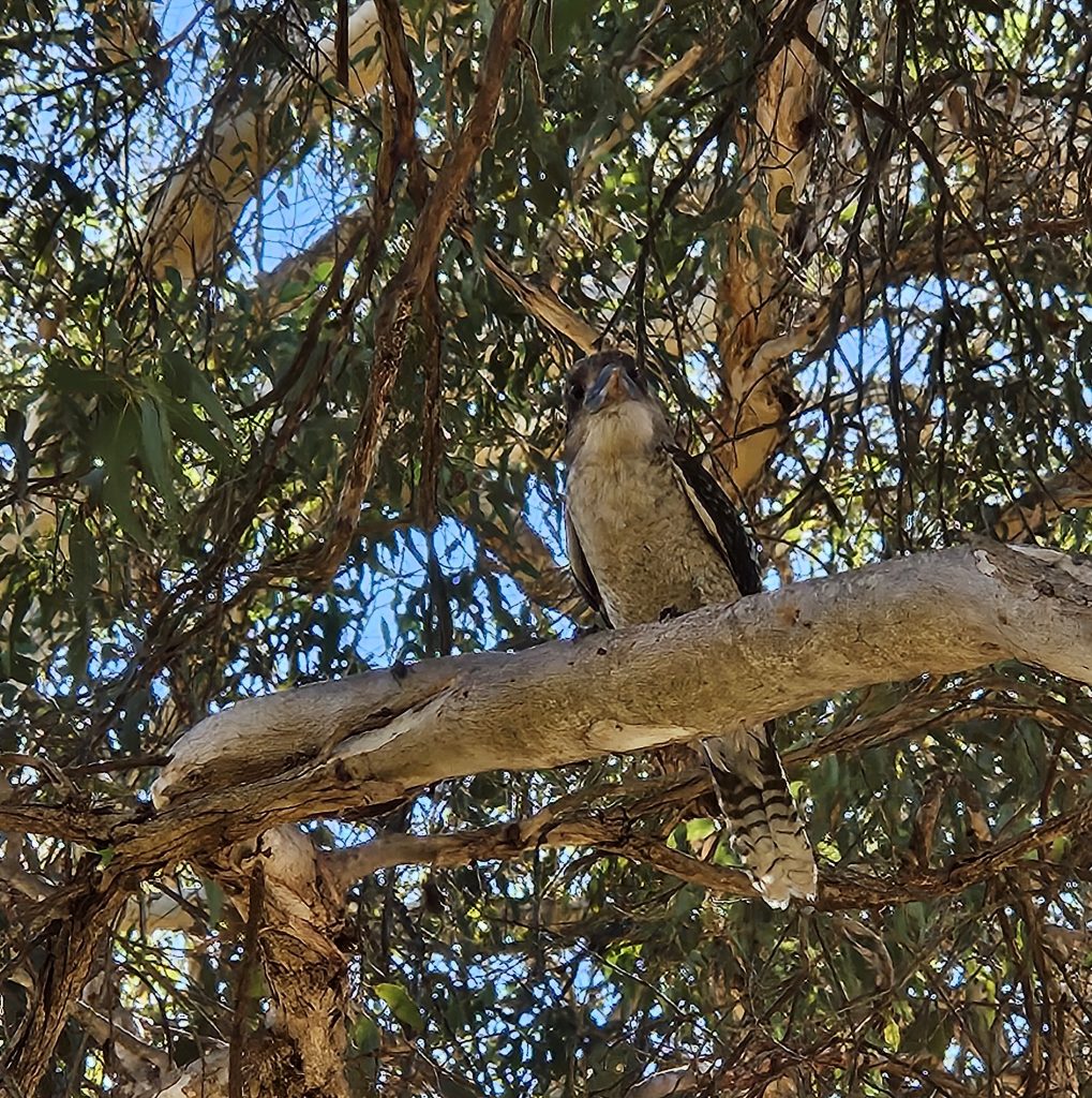 Eine Flötenkrähe, der Lachende Hans (Kookaburra) oder Jägerliest und wahrscheinlich ein Sittich