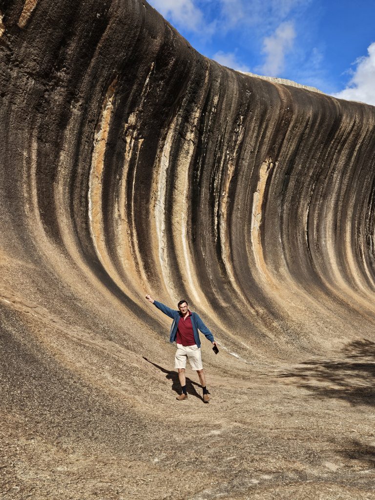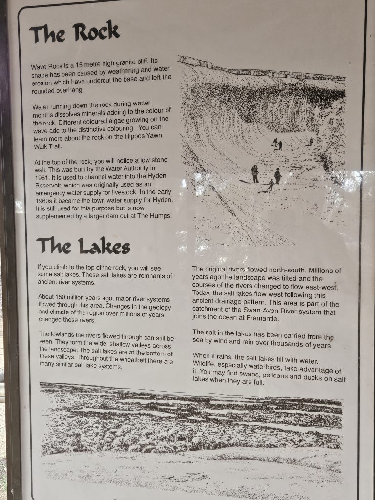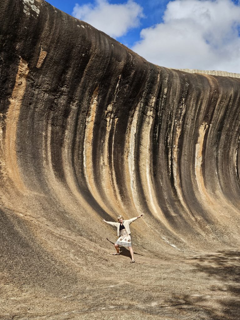 Heute wollen wir die Steinwelle besuchen. Rechts und links von der Straße gibt es nur einige Bäume und lange Strecken sehr trockene Felder. Wave Rock ist eine 15 Meter hohe und 110 Meter lange Gesteinswelle im Süden von Westaustralien. Die rot, gelb und grauen Streifen entstehen durch die chemische Reaktion von Carbonaten und Eisenhydroxiden mit Regen.