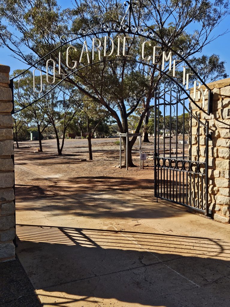 Wir kommen der Goldminenstadt immer näher. Zum Glück treibt der Wind den Rauch in die andere Richtung. Das Tor ist der Eingang zu einem Friedhof.
