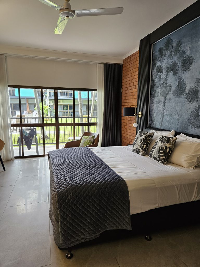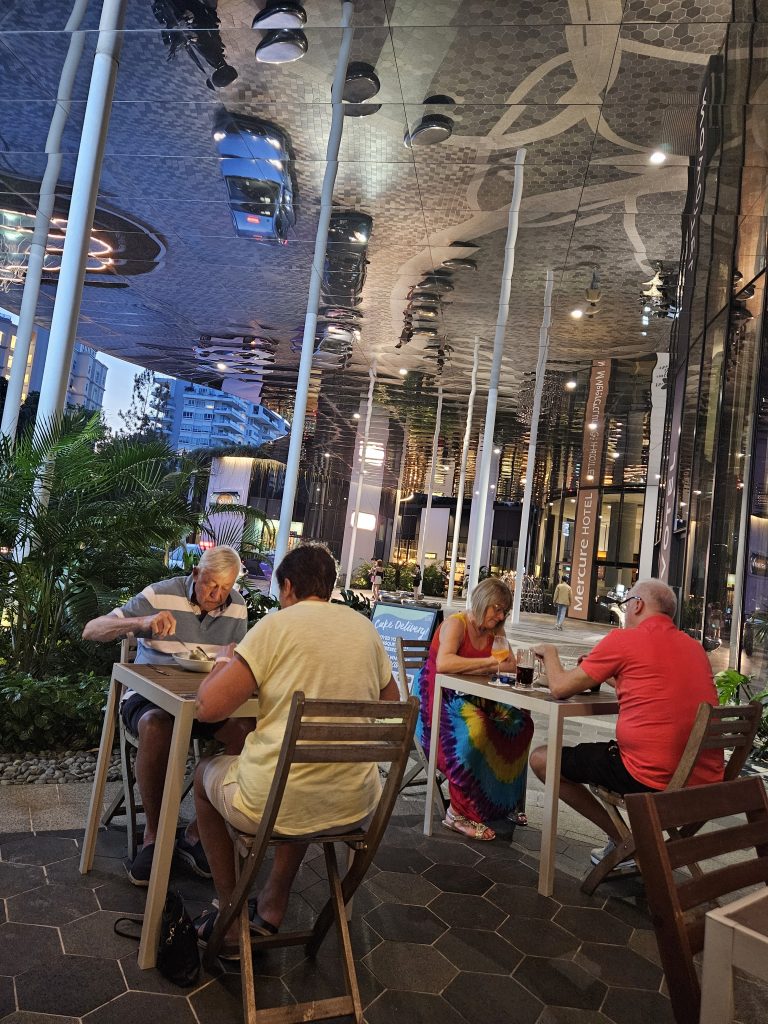 7.45 Uhr stehen wir vor dem Hotel „Mercure on Stevens“. Ein Zimmer sollen wir erst 15.00 Uhr bekommen. Nebenan ist der Frühstücksraum. Wir dürfen uns bedienen und trinken noch einen Kaffee. Gerne würde ich bei 32 Grad Sommersachen anziehen. Zwei Tage kein Schlaf merkt man uns auch langsam an. Einer freundlichen Bedienung klage ich unser Leid. Sie geht noch einmal an die Rezeption und wir können nun ein einfacheres Zimmer schon 11.00 Uhr beziehen. Auch gibt sie uns eine Karte für das Schwimmbad, indem wir uns umziehen, unsere Koffer abstellen und ein paar Runden im ach so warmen Wasser schwimmen und die Liegen ausprobieren.