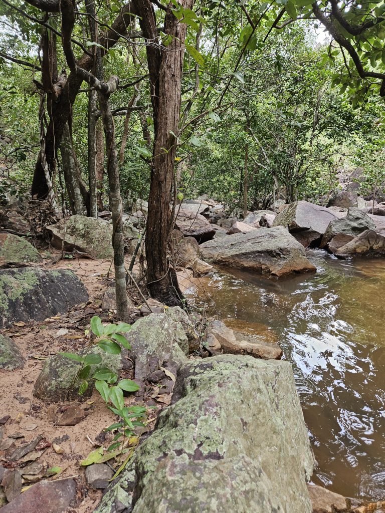 Dann geht es an Land und ein recht beschwerlicher Weg liegt vor uns, bei dem wir abwechselnd die Kinder auf den Rücken nehmen. Belohnt werden wir mit einem Wasserfall und einem herrlichen Bad.