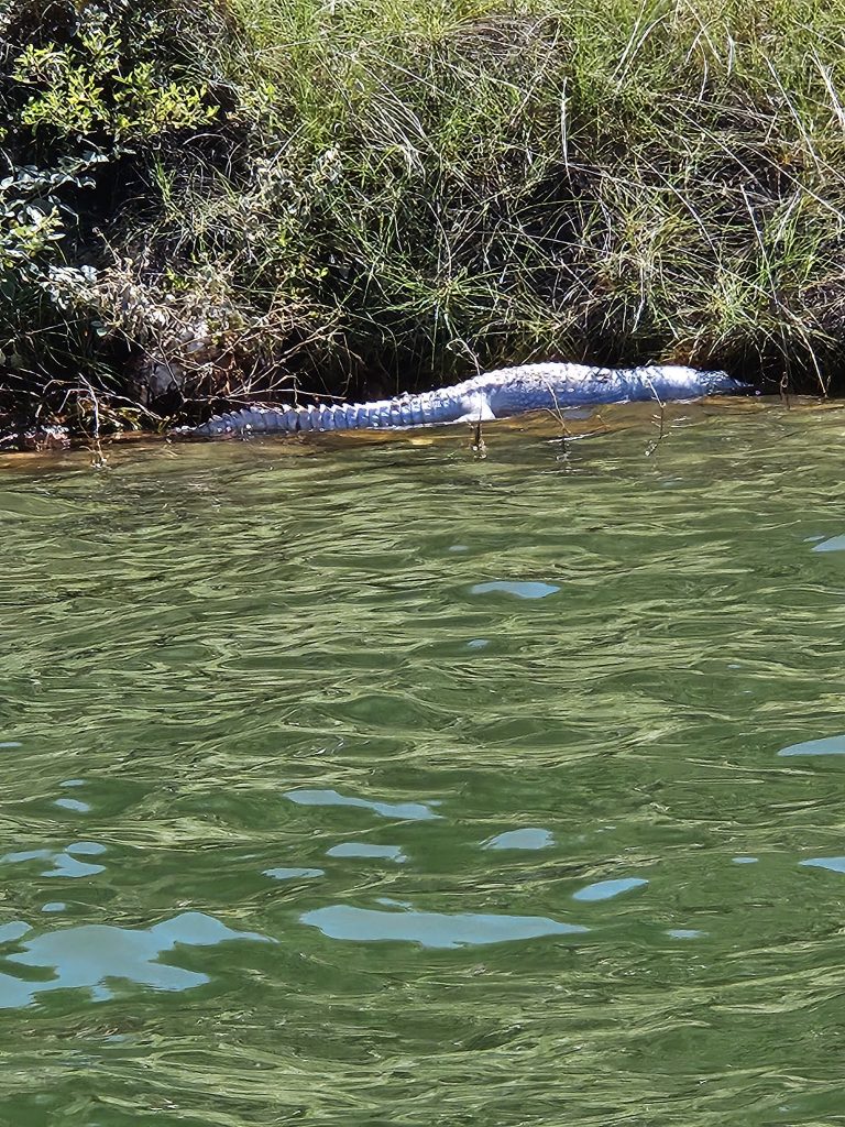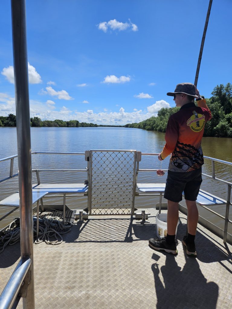 Die Krokodile haben Namen und warten schon auf uns, denn nun werden Angeln mit Fleisch herausgeworfen.