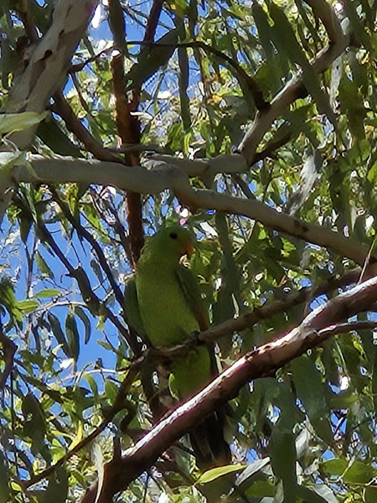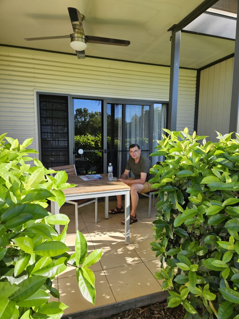 Es gibt eine kleine Grenze von Nord- nach Südaustralien. Das ist die Zollbeamtin. Unsere Melone lassen wir im Norden zurück. Sonst gibt es nichts zu beanstanden. Das Quartier ist wunderbar mit einem Ausblick auf Palmen und die Straße und natürlich einem Pool auf dem Gelände.
