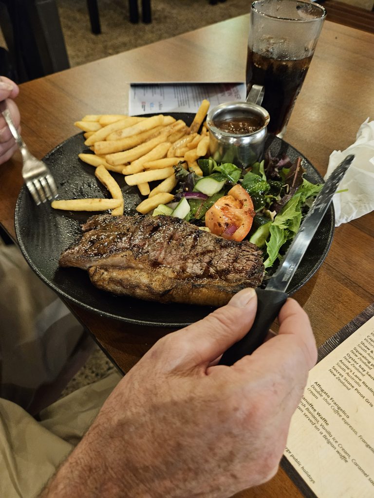 Bevor wir im „Fiddlers green“ Abendbrot essen, holen wir das Auto ab. Der junge Mann von AVIS gibt sich viel Mühe alle Fragen zu beantworten. Da er Feierabend hat, fährt er durch die Stadt voraus bis zu einer Kreuzung, an der er zu seinem Heimatort abbiegt. Wir nehmen die andere Richtung zu unserem Hotel. Das hat beim ersten Mal links fahren sehr geholfen.